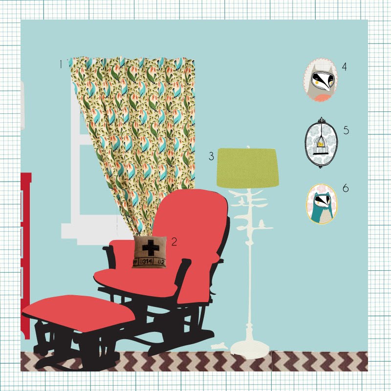Violet’s room is already painted this nice aqua color, so I am trying to create a room that is feminine, but still coordinates with the strong wall color. I am really loving the rose red colors, grounded with splashes of dark brown. Also, years ago I saw the color combo of red, blue, with a nice accent of green in Domino Magazine, and have been dying for a chance to try it out in my own home.