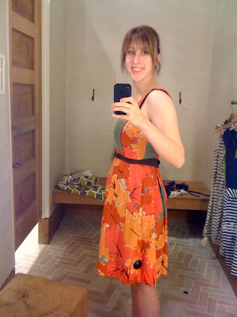 I was so happy to visit an Anthropologie store the other day. I bypassed the racks of beautiful fall clothing, bed linens, even the adorable knitwear for children and went straight for the sale racks. I am a bit of a dress-o-holic (I prefer dresses to jeans anyway of the week) so when I spotted this adorable satin leafy patterned dress, I knew that I had to try it on.