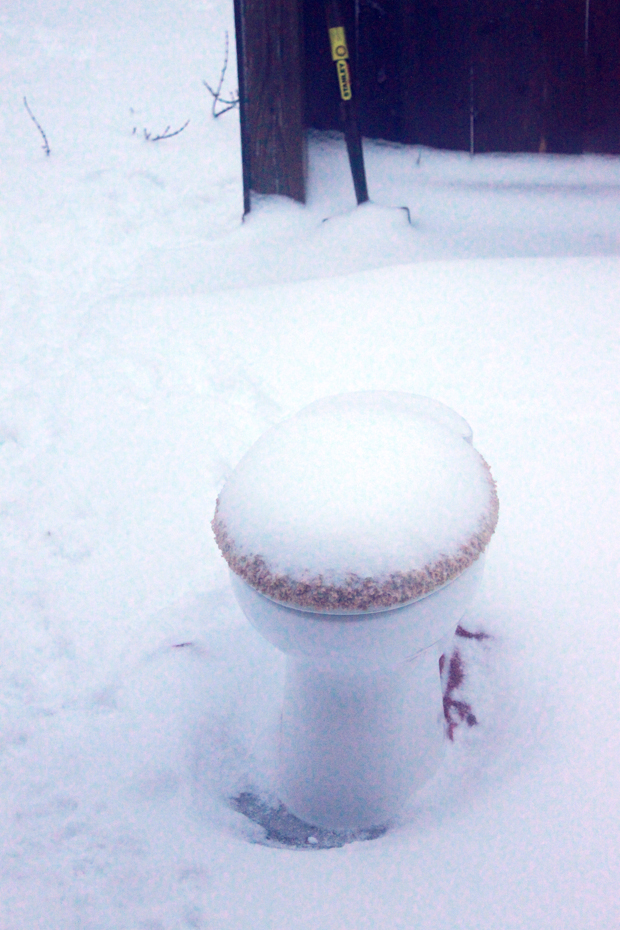 Well, it has snowed quite a bit since the toilet was put in the yard. And we may just have to replace it now, as we cannot tell if the cold weather has ruined the toilet. Here’s hoping that we can have our “stall” reinstated in the near future.