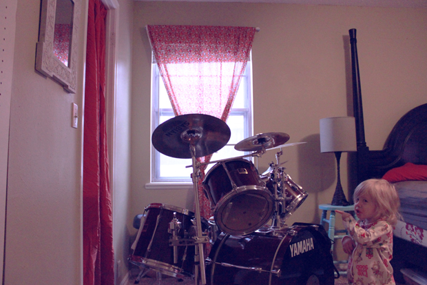 I like pretty things. Drums are not pretty. But these drums happen to be a maroon shade, which happens to sort of go with our bedspread (the lovely Liberty of London Quilt that just about EVERYONE seems to have bought last spring). I cleared out a large space next to the bed while Nathan and Violet were sleeping. When he woke up, I had pulled as many of the drum heads out of storage and put them in the corner, waiting for him to come set up!