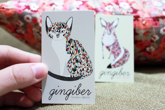 I recently ordered new cards to get me through the holidays, and thought it would be fun to make the fronts of the cards like little mini prints. So now I have “Quilted Fox” business cards and “Calico Cat” business cards, and both say “Gingiber Nursery Decor” below the artwork. On the back, my name is featured prominently, along with my e-mail address, twitter handle, and shop and blog urls. I also have a little coupon code as an incentive for return customers!
