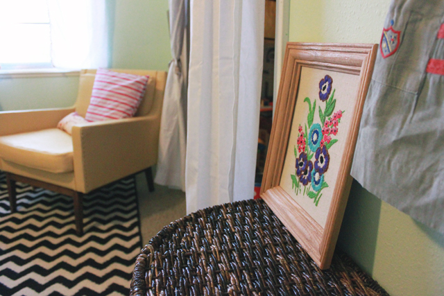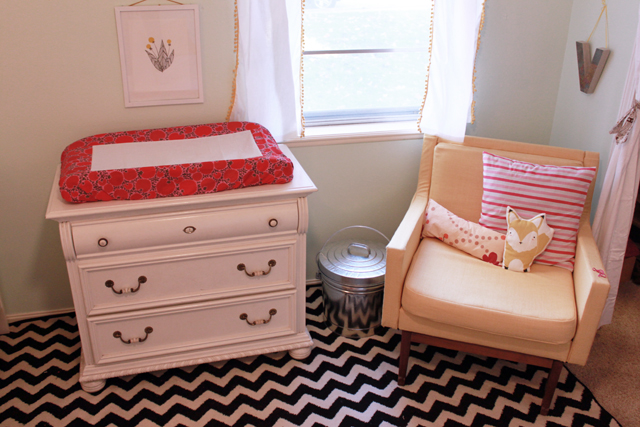 This fabric is rather bright and busy.With all of the other patterns I have going on in the room, I need to exercise some caution with anything else I bring into the room. But this was a great little afternoon project. Oh, and do you see the little diaper pale for Lucy’s cloth diapers? It is actually a $15 air tight dog food holder from Lowes! A girl at a local baby store recommended getting one if I was using cloth diapers.