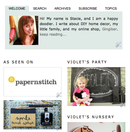 Hi! As you may have noticed (or maybe you haven’t clicked on my blog in a while if you read my blog in a reader) but the GingiberSnap blog has been getting a wee bit fancy, and I thought that I would share with you some great resources and tutorials that have been quite helpful during this transformation! Maybe you will decide to try out a tutorial or two on your own blog! Here are some of my favorite new elements on the blog: