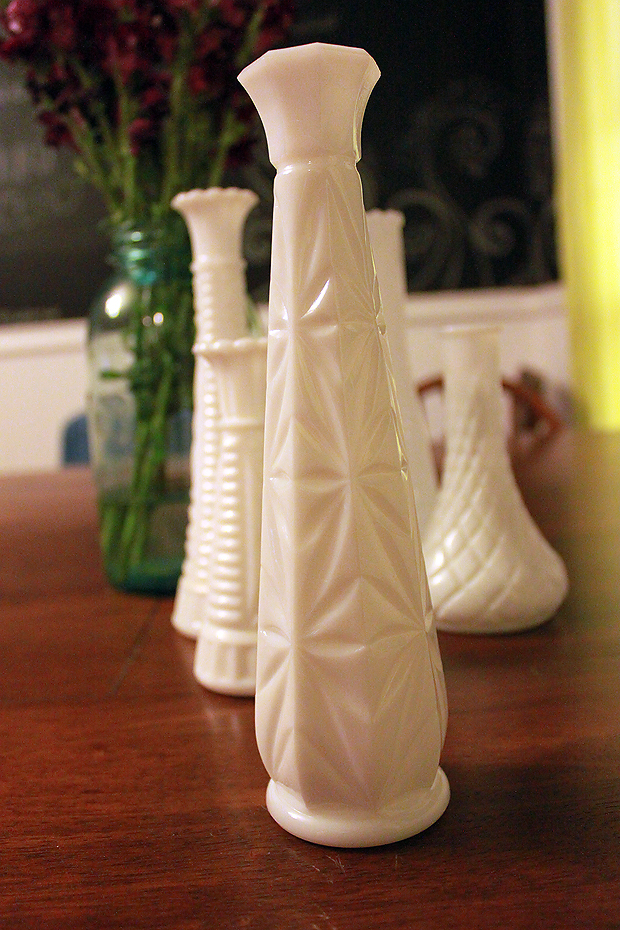 I have a small collection of milk glass bud vases! They are beautiful and I find them for under a $1 all the time.