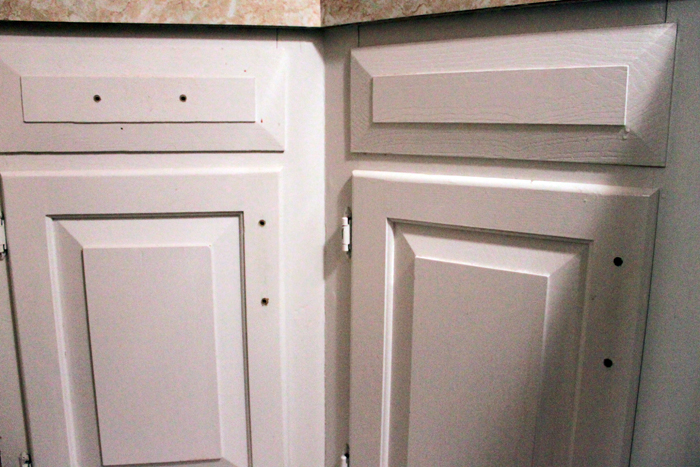 First I removed all of the old handles from the cabinets (the cabinets are staying because I am not about to try and retrofit this odd little stall with storage and new counter tops). I cannot wait to go shopping for new handles!