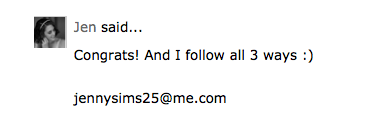 And without further adu: Congratulations, Jen! I will be emailing you shortly.