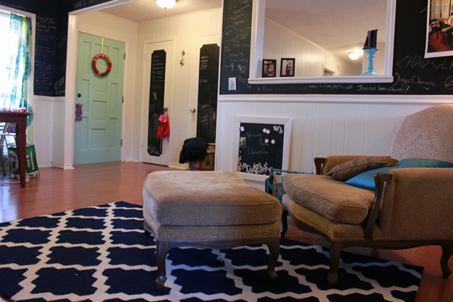 Next, I took this newish rug (originally purchased for the living room, but alas it was too small) and laid it down. The rug is a dark navy blue, but it looks mighty fine against the white bead board and black chalkboard walls! Go ahead, marvel at all of the messages written on the walls. Lately I have been considering repainting them, but I love having 3+ years of memories recorded! If you come visit our home, you get to draw on the walls 🙂