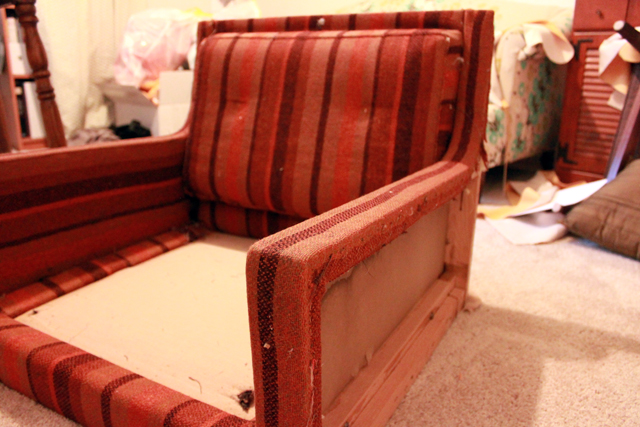 So I finally mustered up enough strength to remove all of the fabric from the armchair for the girls’ room. Actually, Nathan helped me, because it takes a lot of strength and tugging to remove staples and fabric from a chair frame.